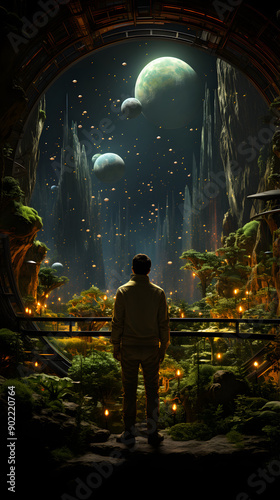 © Aditya, Fototapeta premium A lone figure stands in a futuristic, moss-covered garden, gazing out at a breathtaking view of a night sky filled with stars, planets, and glowing orbs.