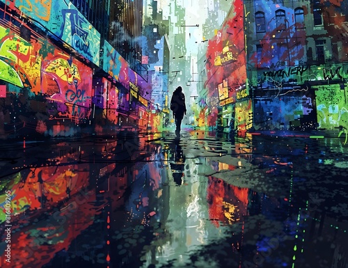 Naklejka premium “A lone figure traverses a vibrant urban landscape, mirrored in the wet ground, amidst buildings adorned with colorful graffiti.
