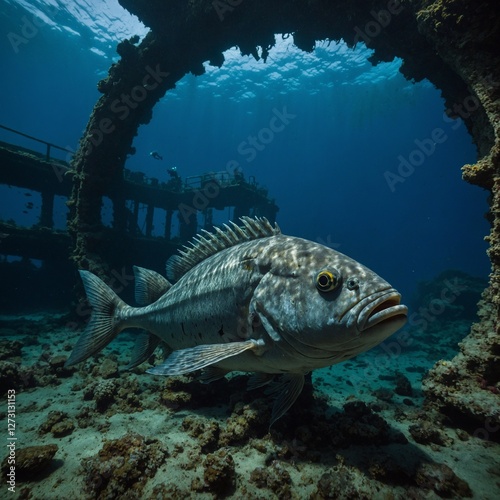 © Muhammad, Fototapeta premium A lone fish resting inside a sunken shipwreck.