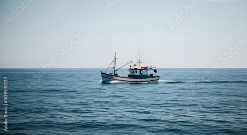 Naklejka premium A lone fishing boat sails across the calm blue ocean under a clear, bright sky.