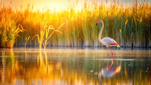 © Watcharapon, Fototapeta premium A lone flamingo standing in a shallow lake surrounded by tall reeds and water lilies, its pink feathers glowing in the soft sunlight filtering through the water , water lilies, reeds
