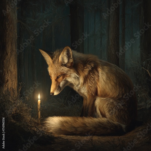 © Freedom in Life, Obraz premium A lone fox sits in a dark forest illuminated by a single lit candle animal