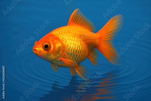 Naklejka premium A lone goldfish glides effortlessly on a tranquil blue sea, its vibrant...