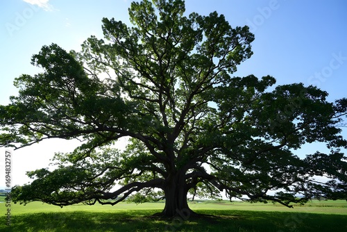 © Mahannan, Fototapeta premium A lone green oak tree stands in a lush meadow under a summer blue sky with white clouds