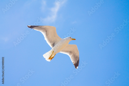 © Galyna Chyzh, Obraz premium A lone gull in a clear blue sky with small white clouds.
