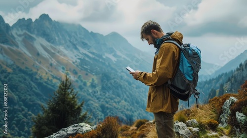 Naklejka premium A lone hiker captures the mountain scenery with a mobile phone.