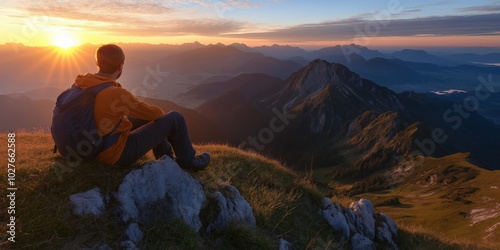 © gunzexx png and bg, Naklejka premium A lone hiker sits on a rocky outcrop, captivated by the stunning sunrise over a majestic mountain range. Silhouetted against a vibrant orange-pink sky, feeling blissful.