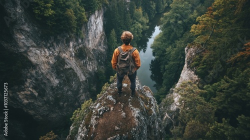 © Oulaphone, Obraz premium A lone hiker stands at the edge of a cliff, overlooking a serene river surrounded by lush, green trees, embodying adventure and nature's beauty.