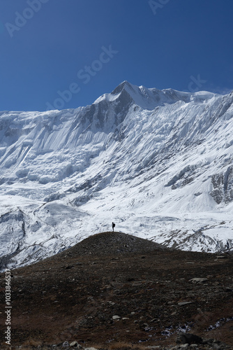 Fototapeta premium A lone hiker stands on a hilltop, gazing at the majestic snowy mountain in...