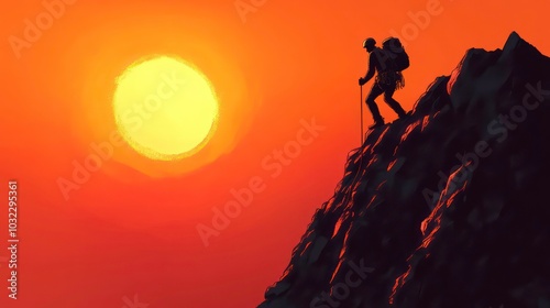 Fototapeta premium A lone hiker stands on a mountain peak at sunset, silhouetted against the bright orange sky.