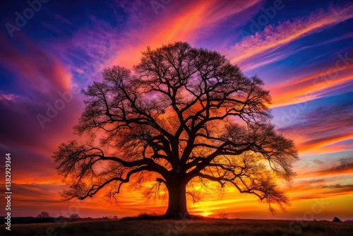© Autun, Fototapeta premium A lone oak tree, a powerful silhouette, dominates the landscape beneath a breathtaking sunset sky.