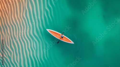 © Premium_art, Obraz premium A lone paddleboarder glides through turquoise waters with a sandy bottom.