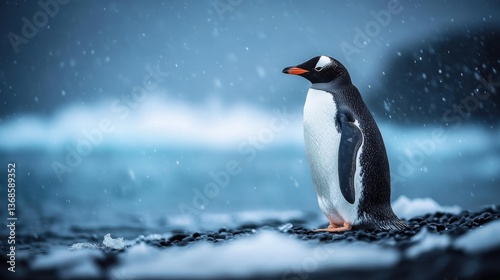 © SM-Design, Obraz premium A lone penguin bravely facing a blizzard