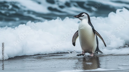 © arthit, Fototapeta premium A lone penguin waddling across an icy shore, making its way toward the ocean.