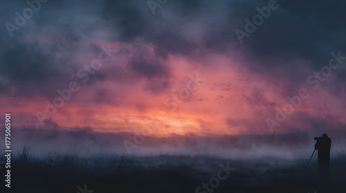 © Thares2020, Obraz premium A lone photographer captures a misty sunrise over a grassy field with birds flying in the colorful sky