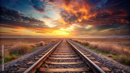 Obraz premium A lone railway track stretches towards a vibrant sunset, traversing a vast,...