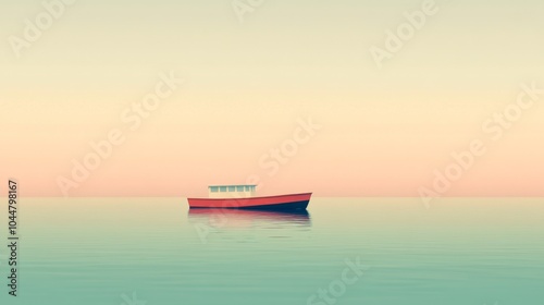 Naklejka premium A lone red boat sits on a calm, glassy sea with a pastel pink and orange...