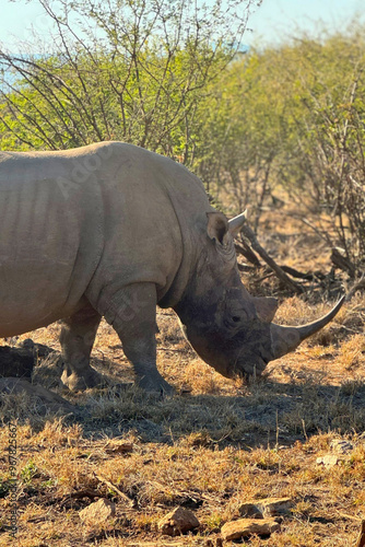 © Katie, Fototapeta premium A lone Rhino in the South African savannah with a large horn.