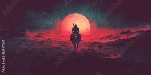 Fototapeta premium A lone rider on horseback beneath a radiant crimson sun