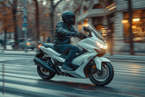 © Larisa AI, Fototapeta premium A lone rider zips through the city streets, their motorcycle's fairing slicing through the wind as they navigate the urban landscape on their motorbike, the vibrant buildings blurring by in a rush of