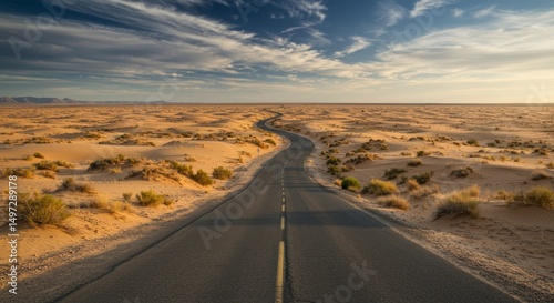 © Arifin Studio, Fototapeta premium A lone road winds through a vast, sandy desert landscape under a dramatic sky