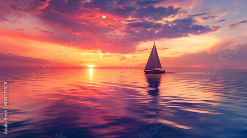 © Muhammad, Fototapeta premium A lone sailboat drifting on a vast ocean at sunset, the sky a blazing mix of red, orange, and purple, reflecting on the water's surface