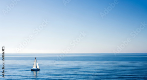 © Ozi, Obraz premium A lone sailboat glides across a vast, serene ocean under a clear, bright sky.