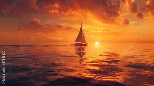 © Syahrul Zidane A, Fototapeta premium A lone sailboat on a calm ocean at sunset with a vibrant orange sky