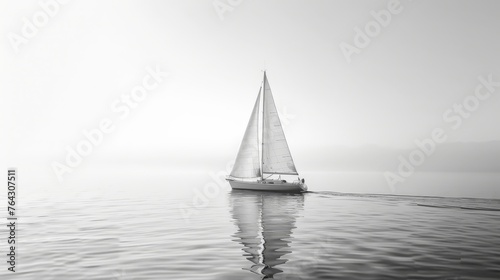 © Olive Studio, Fototapeta premium A lone sailboat on calm waters with minimalistic waves AI generated illustration