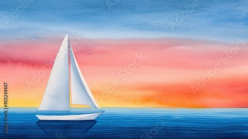 © JR-50, Obraz premium A lone sailboat sails on a tranquil sea under a vibrant, colorful sunset sky.