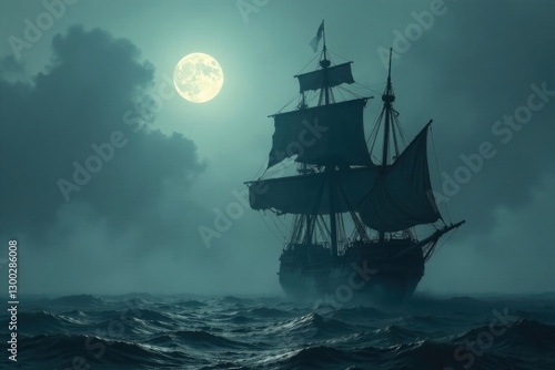 Fototapeta premium A lone sailing vessel navigates a moonlit, tempestuous sea under a brooding...