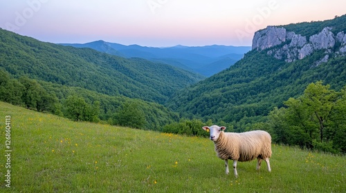 © A4719, Fototapeta premium A lone sheep stands in a vibrant green field dotted with wildflowers, overlooking a vast valley with lush green hills and distant rocky cliffs under
