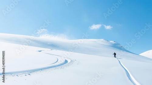 Obraz premium A lone skier carves a turn through pristine, powder-covered slopes under a clear, blue sky