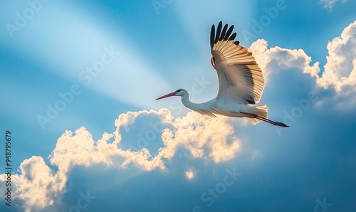 Fototapeta premium A lone stork gliding peacefully, sunlight streaming through the clouds