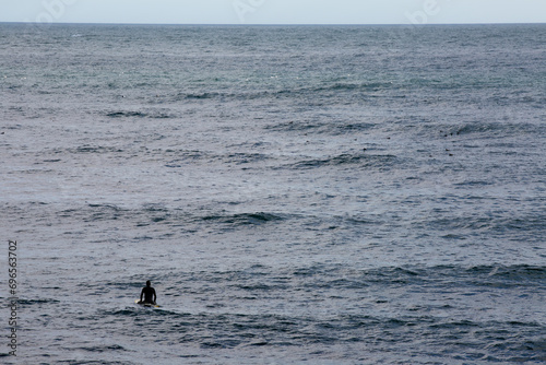 Obraz premium A lone surfer silhouette sitting alone in the ocean waves. Depicting...