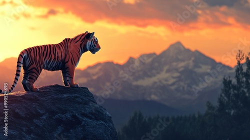© h4kunA, Fototapeta premium A lone tiger stands on a rock overlooking a mountain range at sunset.