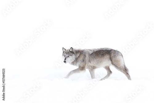© Jim Cumming, Naklejka premium A lone Timber wolf or Black wolf with silver coloured coat walking in the winter snow in Canada