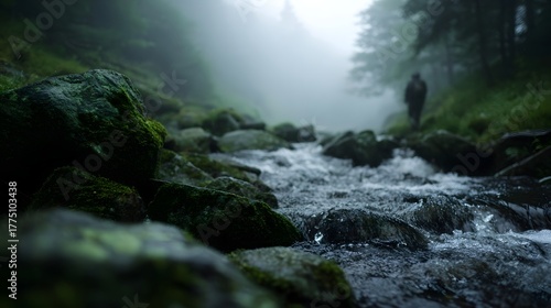 Naklejka premium A lone traveller walks along a stream flowing through a misty moss covered...