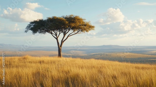 Fototapeta premium A lone tree on a hilltop in the middle of an expansive savannah grassland.