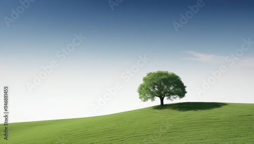 © Abbas, Fototapeta premium A lone tree on a verdant hill with a white background and a clear blue sky