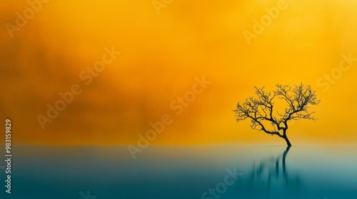 © Wall, Fototapeta premium A lone tree painted in the center of a water body, surrounded by a yellow sky background