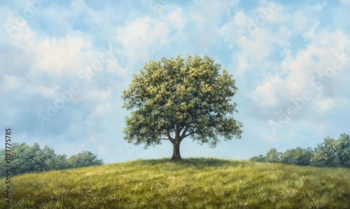 Fototapeta premium A lone tree standing tall amidst a lush meadow with a soft blue sky above,...