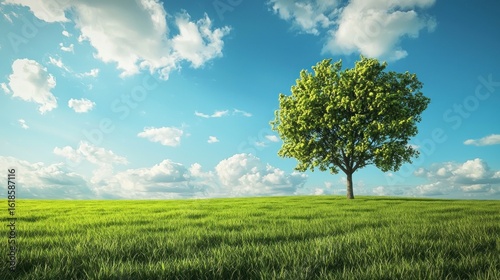 Obraz premium A lone tree stands in a vast, green field under a clear blue sky with fluffy...