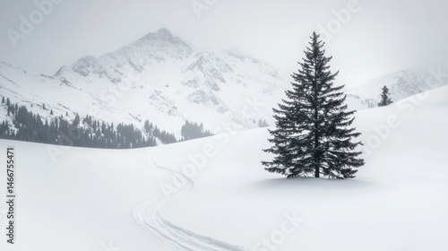 © Серг Нечаев, Naklejka premium A lone tree stands in the snow, with a mountain range in the background.