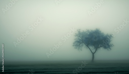 Fototapeta premium A lone tree stands silhouetted against a thick, mysterious fog, evoking a sense of isolation, solitude, and ethereal beauty, with the mist swirling around it like a ghostly shroud