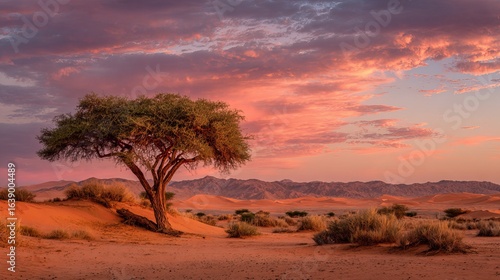 © Zannatul, Obraz premium A lone tree stands silhouetted against a vibrant sunset in the desert