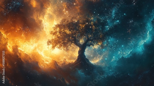© Umi Sakina, Naklejka premium A lone tree stands tall against a backdrop of swirling orange and blue nebulae, its branches reaching towards a sky filled with stars.