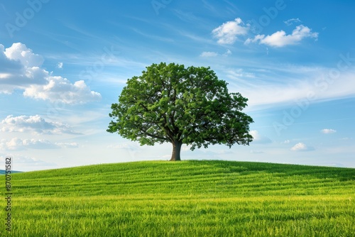 © Ai-Pixel, Fototapeta premium A lone tree stands tall on a grassy hill against a bright blue sky.