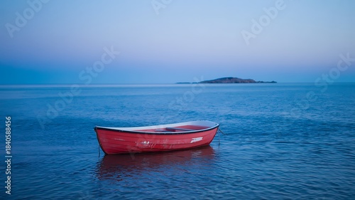 © NAEEM, Naklejka premium A lone vibrant red rowboat gently floats on tranquil water under a dusky blue and purple sky with a distant island at the horizon.