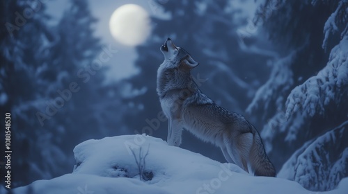 © Galib, Obraz premium A lone wolf howls at the full moon in a snowy forest.